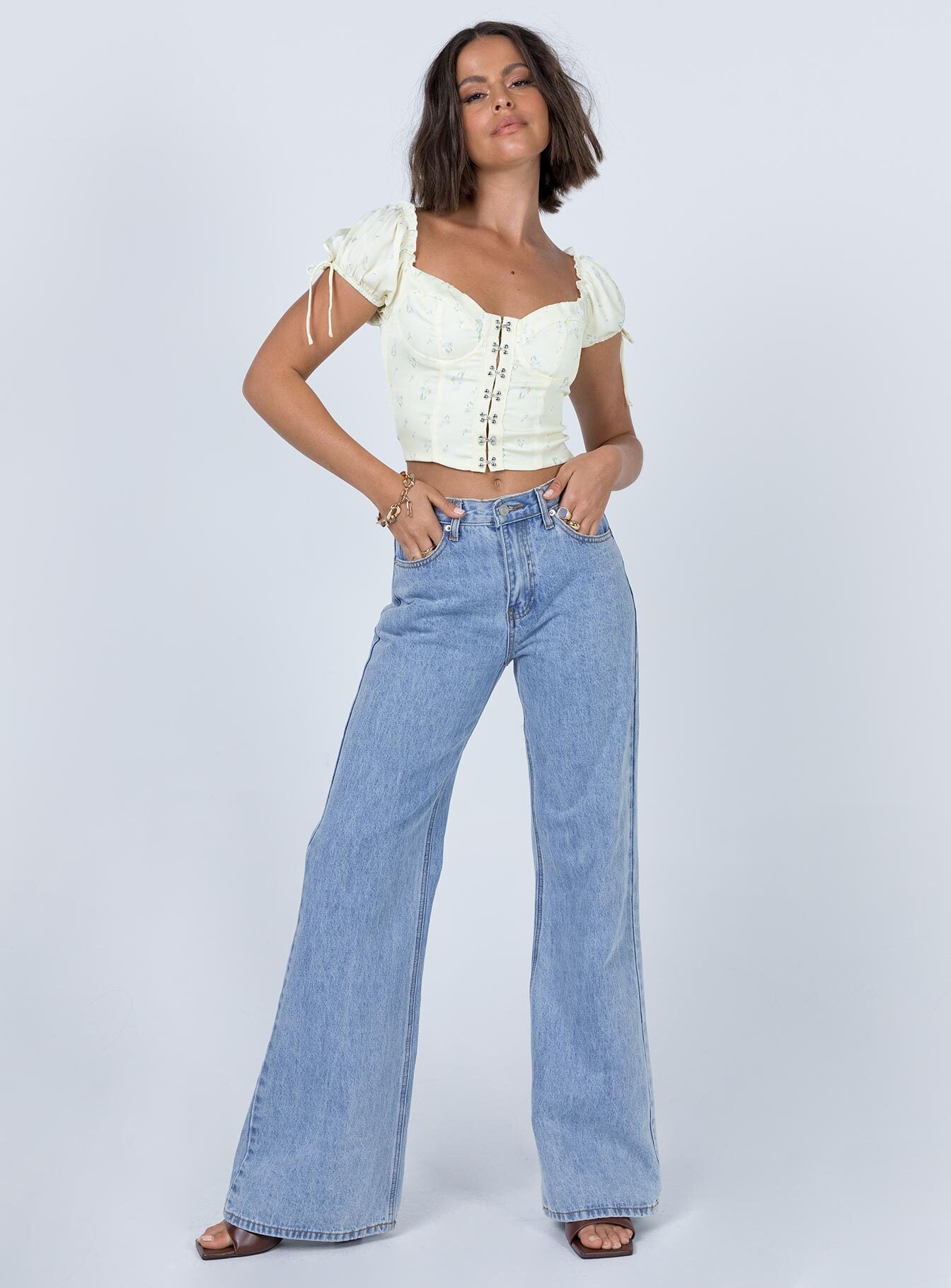 - Short puff sleeves with tie